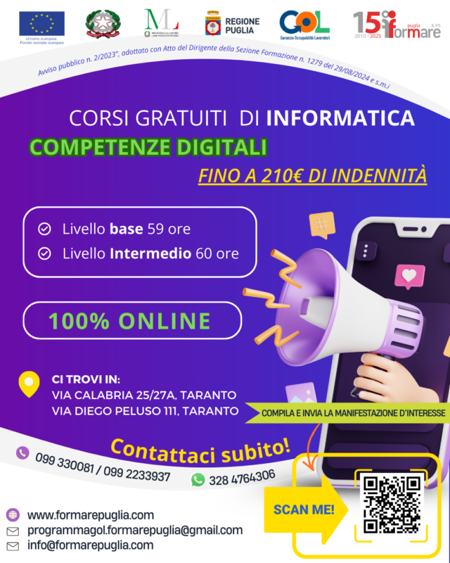 I corsi sono riservati a disoccupati, studenti, percettori di sostegno al reddito o ammortizzatori sociali, soggetti fragili, di età compresa tra i 18 e i 64 anni, residenti in Puglia.